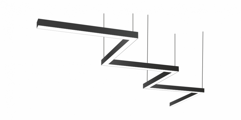 Фигурный светодиодный Светильник Зигзаг LiNE-Pro 6х500mm 60W 3000K черный предназначен для накладного или подвесного монтажа на тросовые подвесы. Изготовлен из сплошного сварного алюминиевого профиля в виде зигзага. Высота установки светильника регулируется подвесом с цанговым тросовым зажимом и может варьироваться от 0,05 метра до 4 метров от основного потолка. Светильник Зигзаг имеет равномерную засветку по всей площади рассеивателя. Источник питания находится внутри корпуса. Торцевые заглушки входят в комплект. Возможно изготовление светильника с магистральной проводкой для соединения нескольких светильников в сплошную конструкцию
