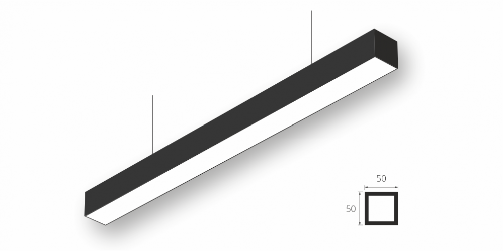 Линейный светодиодный Подвесной светильник LiNE-Pro 50x50 1250mm 19W 6000K Черный предназначен для подвесного монтажа на тросовые подвесы. Изготовлен из алюминиевого профиля длиной 1250 мм, мощностью 19 Вт c цветовой температурой 6000 K, цвет корпуса Черный. Высота установки светильника регулируется подвесом с цанговым тросовым зажимом и может варьироваться от 0,05 метра до 4 метров от основного потолка. Линейный светильник может использоваться для реечных потолков. Светильник имеет равномерную засветку по всей площади рассеивателя. Источник питания находится внутри корпуса. Торцевые заглушки входят в комплект.