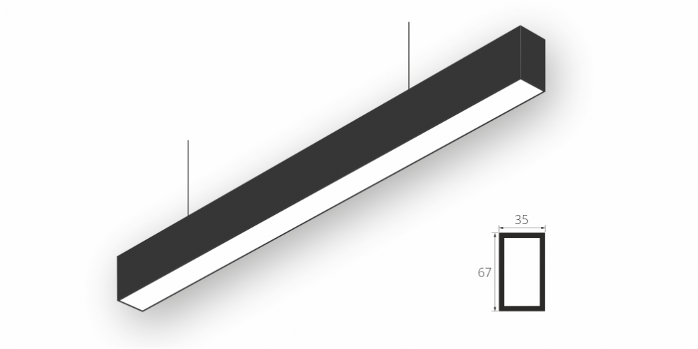 Линейный модульный светодиодный Подвесной светильник LiNE-Pro 67x35 1250mm 38W 5000K Черный предназначен для подвесного монтажа на тросовые подвесы. Изготовлен из алюминиевого профиля длиной 1250 мм, мощностью 38 Вт c цветовой температурой 5000 K, цвет корпуса Черный. Светильники соединяются в сплошную линию с помощью комплекта линейного соединения и сплошной магистральной проводки. Светильник имеет равномерную засветку по всей площади рассеивателя. Источник питания находится внутри корпуса.